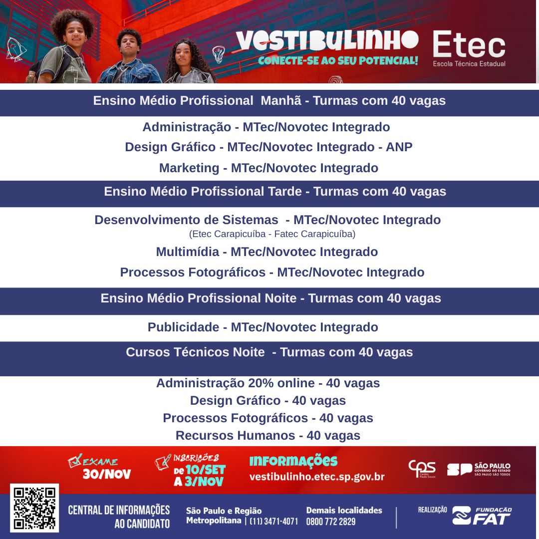 Teremos um posto de inscrição na Secretaria Acadêmica da Etec localizada na Av. Francisco Pignatari, 650 – Vila Gustavo Correia, Carapicuíba, o horário funcionamento será de segunda a sexta-feira, das 10h às 13h e das 15h às 19h (exceto no dia 03/11/2025 que será das 10h às 13h e no dia 27/10 não terá atendimento por motivo do feriado do Dia do Funcionário Público).